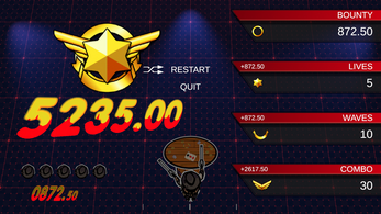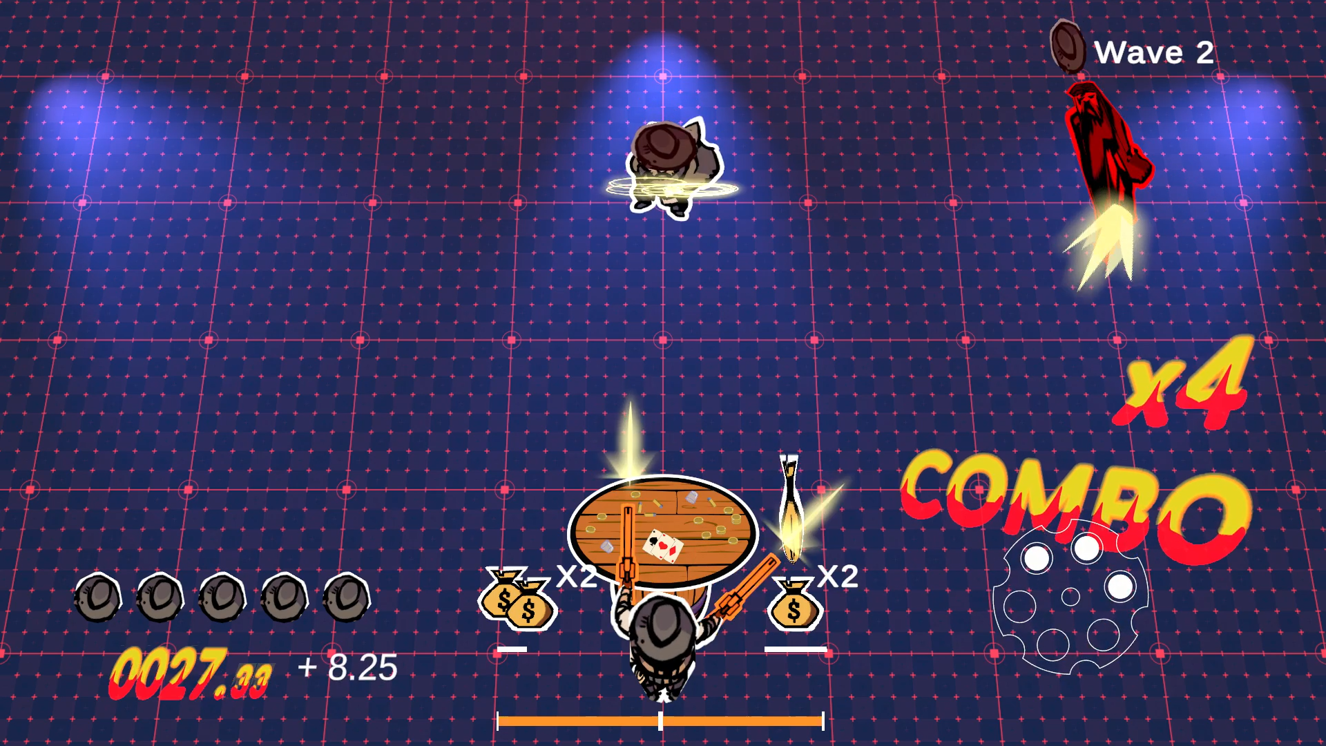Take cover behind either side of the table to avoid incoming fire, but don’t stay hidden for too long or you risk dropping your combo. Grab bounty bags dropped during combo kill chains, rewarding aggressive and stylish play. Master the balance between risk and safety to maximize your score!